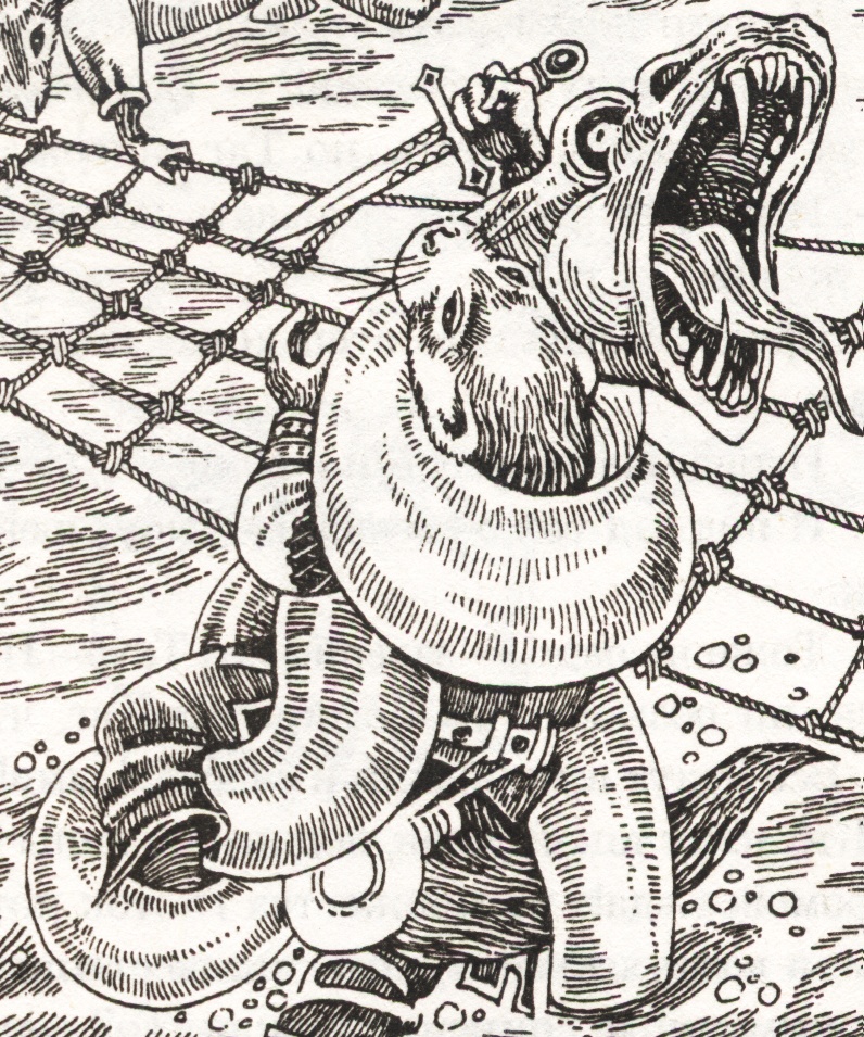 Гигантский угорь из пещеры землероек-пигмеев. Землеройки приносили ему в жертву своих сородичей, чтобы тот не тревожил, но Таг вступился за землероек и убил угря. (