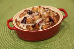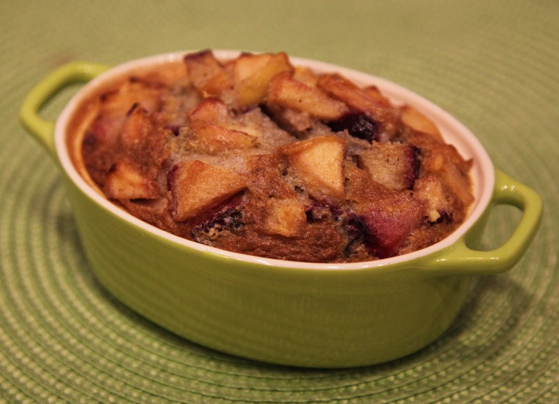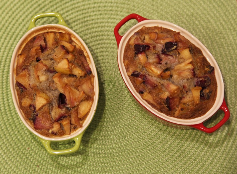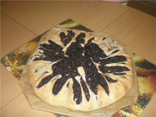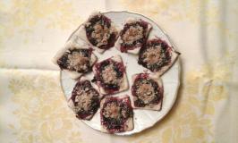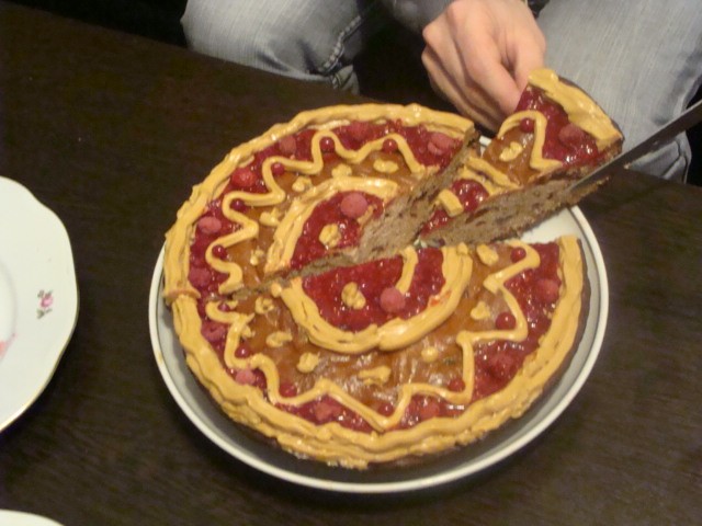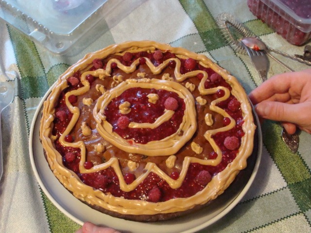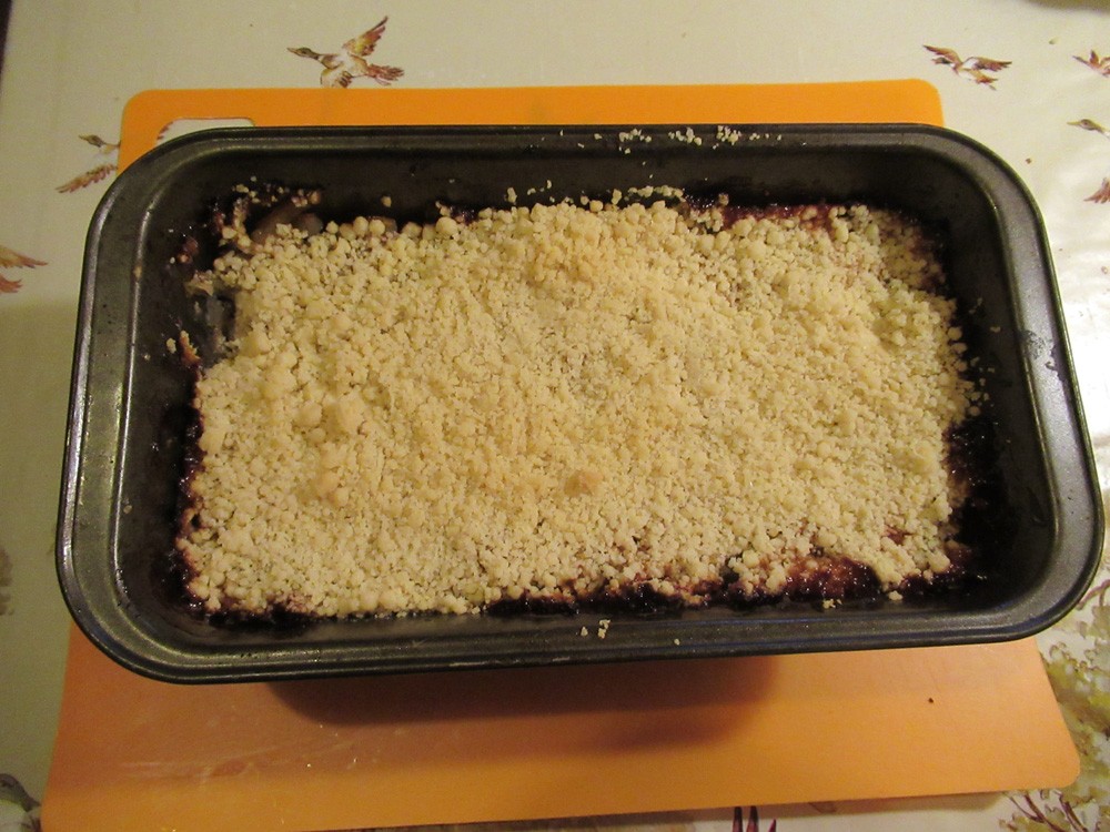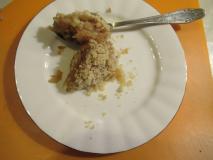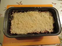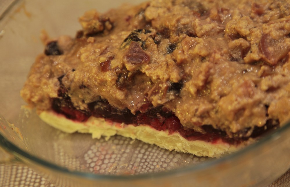 "И, наконец, центральным блюдом был великолепный землянично-сливово-черносливовый флан на подушке из красносмородинового желе с основой из слоёного пирога."